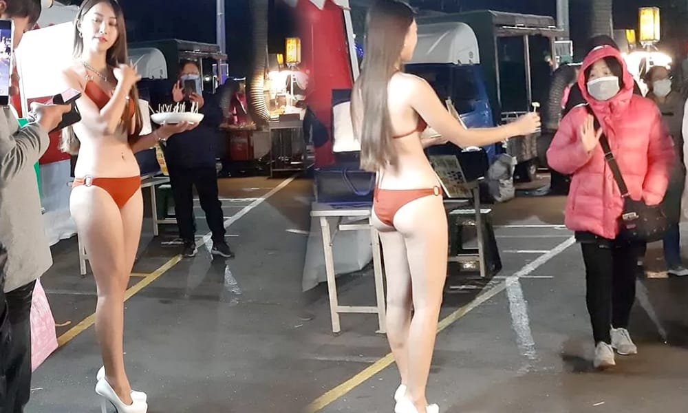 Tauke Kaut Untung, Wanita Berbikini Jual Jambu Walaupun Di Musim Sejuk!