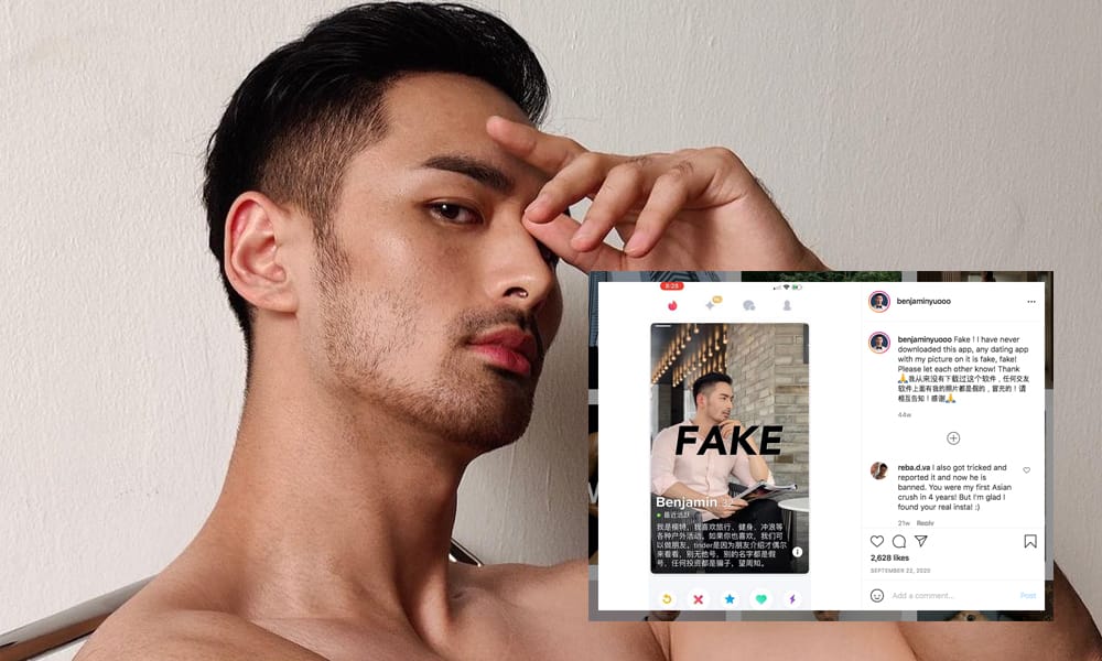 Fake! Caption yang diletakkan ke atas gambar berlambakan akaun IG yang menyamar jadi dirinya. Manakala, Benjamin menulis “Fake!I have never downloaded this app, any dating app with my picture on it is fake, fake! Please let each other know! Thank .” ke atas aplikasi dating yang menggunakan dirinya.